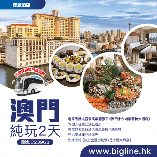 【星級酒店】奢華品牌法國雅高集團旗下《澳門十六浦索菲特大酒店》保證入住獨立浴缸客房 重本包索菲特酒店海風餐廳自助晚餐 貼心安排澳門旅遊巴 滋味品嚐【位上金湯佛跳墻+芝士焗大蝦宴】純玩2天