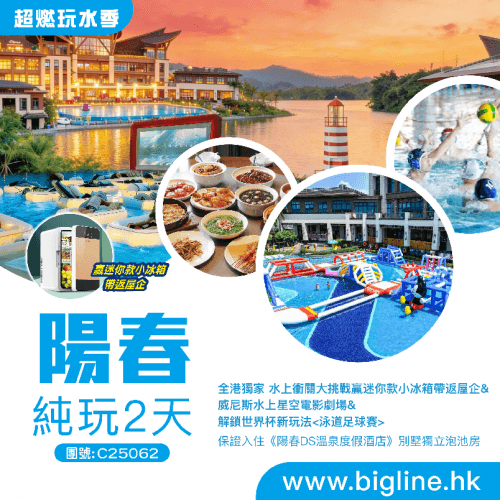 【超燃玩水季】全港獨家 水上衝關大挑戰贏迷你款小冰箱帶返屋企&威尼斯水上星空電影劇場&解鎖世界杯新玩法 保證入住《陽春DS溫泉度假酒店》別墅獨立泡池房 純玩2天