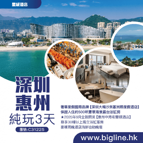 【星級酒店】奢華度假國際品牌【深圳大梅沙京基洲際度假酒店】保證入住約500呎豪華海景露台浴缸房★2025年9月開業【惠州中海希爾頓酒店】尊享30樓以上獨立浴缸客房 豪嘆兩晚酒店海鮮自助晚餐 純玩3天