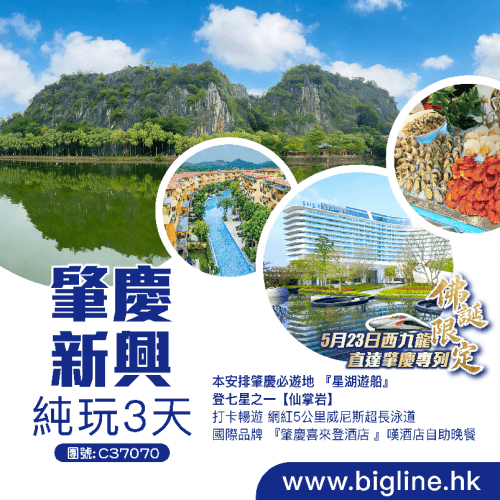 【5.23西九龍直達肇慶專列】重本安排肇慶必遊地 『星湖遊船』 登七星之一【仙掌岩】 打卡暢遊 網紅5公里威尼斯超長泳道 國際品牌 『肇慶喜來登酒店 』嘆酒店自助晚餐純玩3天