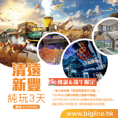 【佛誕&端午限定】 一家大細玩轉至HIT熱點『清遠長隆森林王國』+「JOYPOLIS廣州華夏世嘉都市樂園」國際品牌【露台獨立泡池客房】嘆兩晚酒店自助晚餐 純玩3天