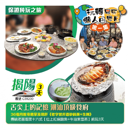 《玩轉粵東粵北懶人包-第一集》舌尖上的潮汕記憶 潮汕頂級食府《36個月脫骨鵝掌+鵝肝》《老字號非遺砂鍋粥+生醃》傳統老厝潮菜【位上紅燒鮑魚+牛油果雪燕】 西九龍高鐵往返 純玩3天