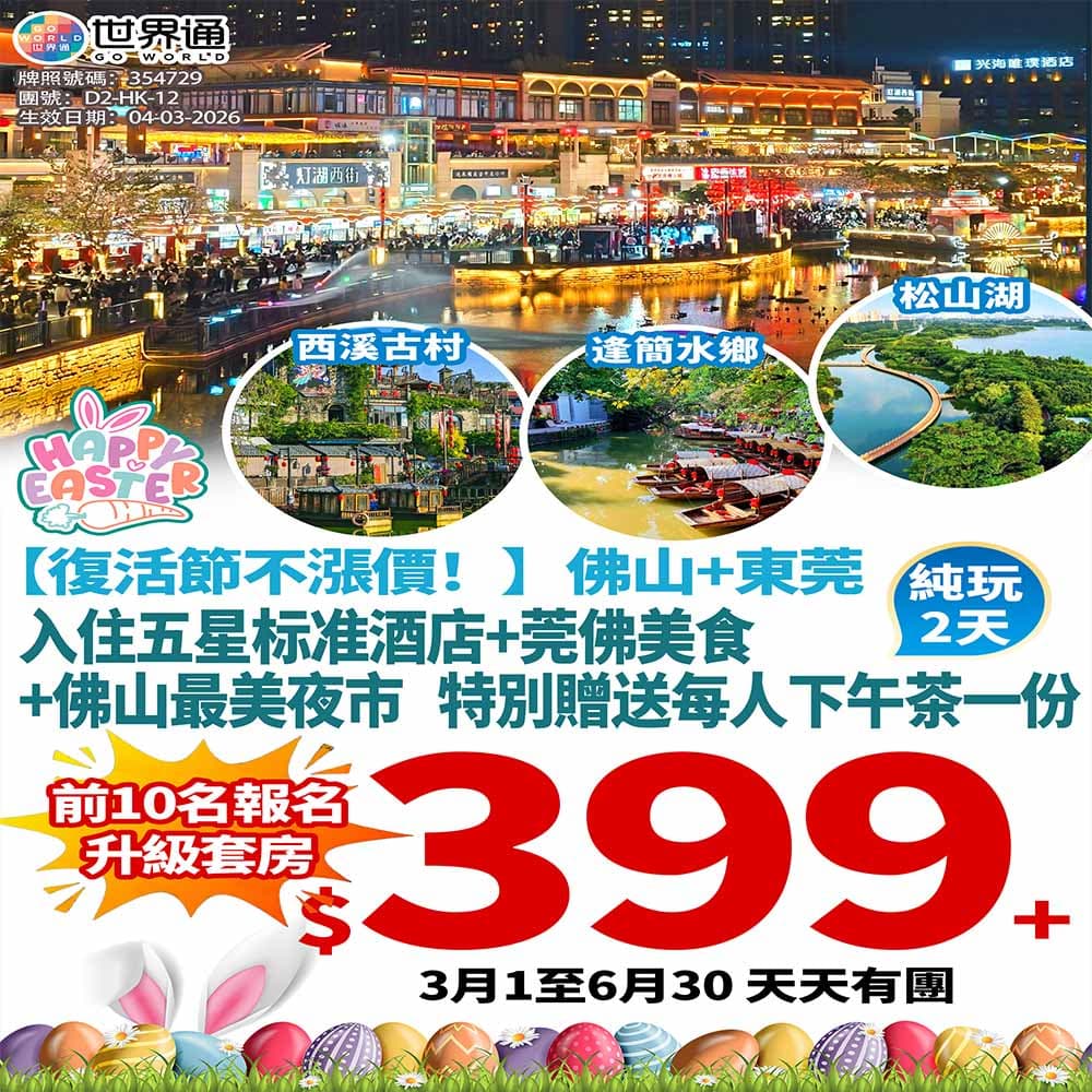 資料更新:2026年4月20日 下午09:16 更新【佛莞】美食悠閑纯玩兩天於 世界通目的地 中國內地2 天 1 晚歎食美食團費團費(參考)HK$399以旅行社網站顯示之價格為準旅行團連結行程重點出發日期(參考)以下為資料庫所載之檔期分類;實際報名及余位以旅行社為準。報名熱烈 · 名額有限2026年5月14日2026年5月26日所有參考出發日2026年5月14日 · 2026年5月26日更多圖片