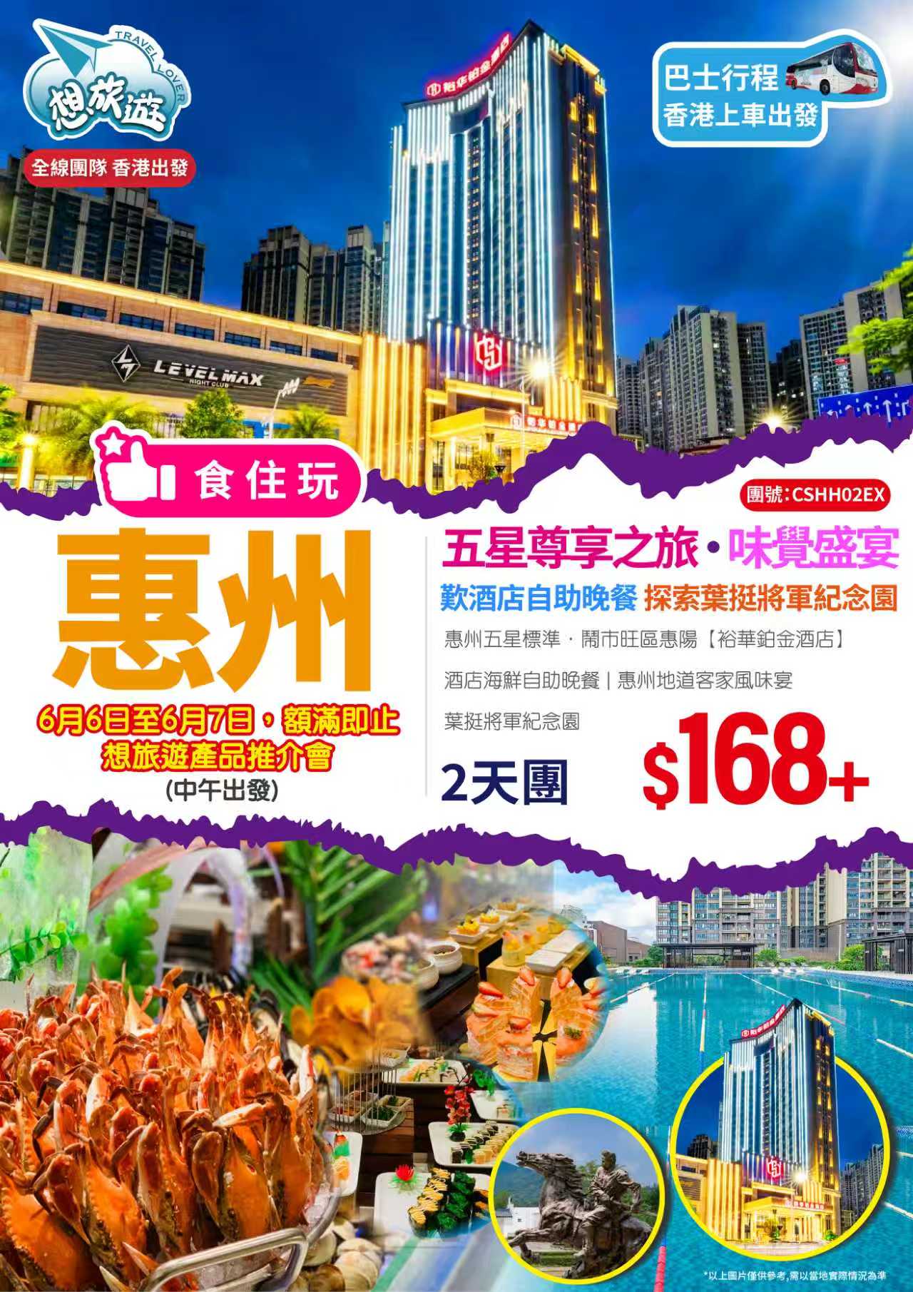- 精選暢玩:葉挺將軍紀念園 特色品嘗:惠州地道客家風味宴、酒店海鮮自助晚餐 舒適入住:裕華鉑金酒店
