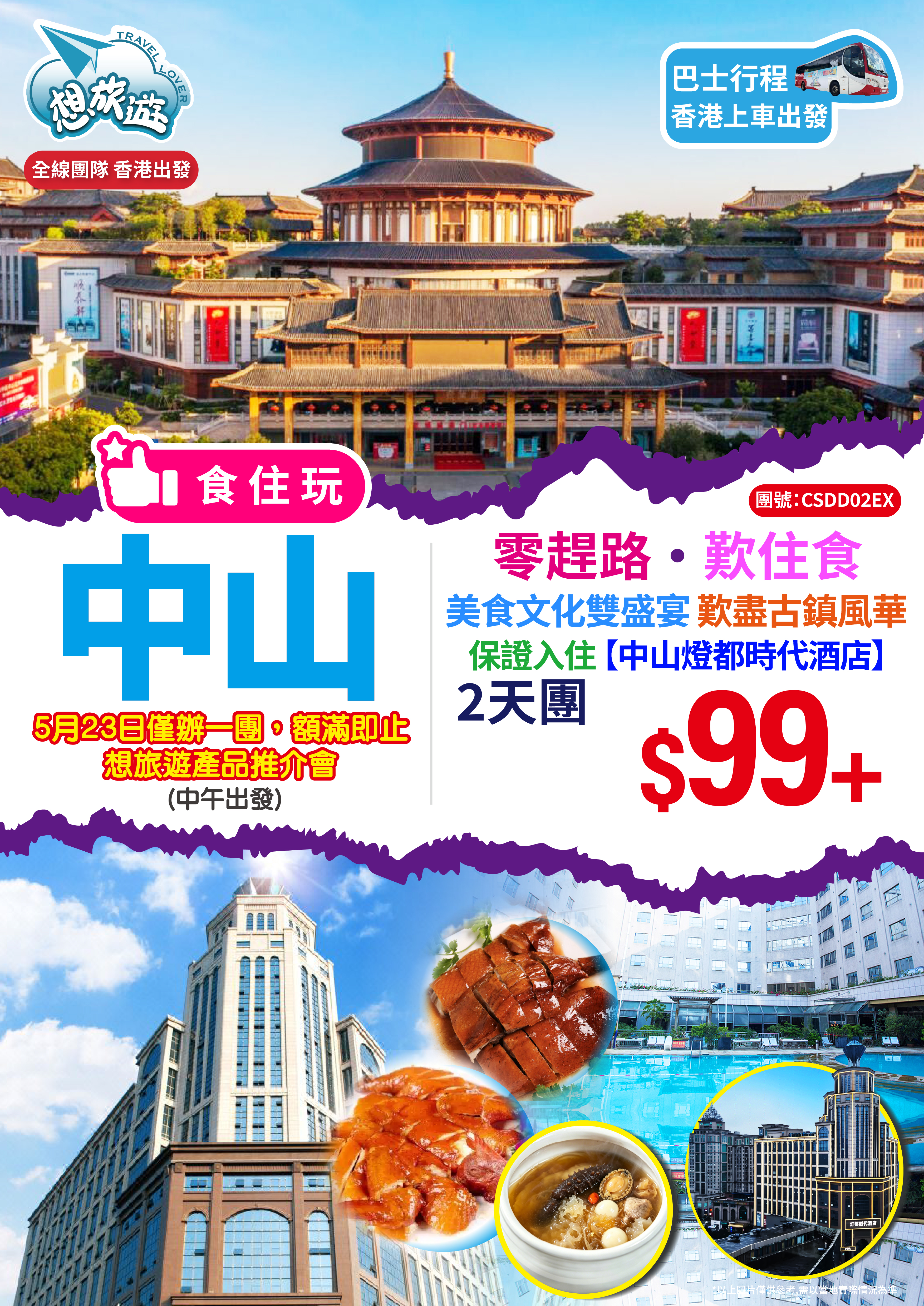 - 精選暢玩:紅博城、莊園春 特色品嘗:至尊佛跳牆宴、玫瑰豉油雞+明爐燒鵝宴 舒適入住:中山燈都時代酒店