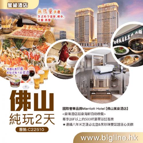 【星級酒店】國際奢華品牌Marriott Hotel【佛山萬豪酒店】尊享28F以上約500呎豪華浴缸客房★連續八年米芝蓮必比登&黑珍珠雙認證匠心美饌 純玩2天