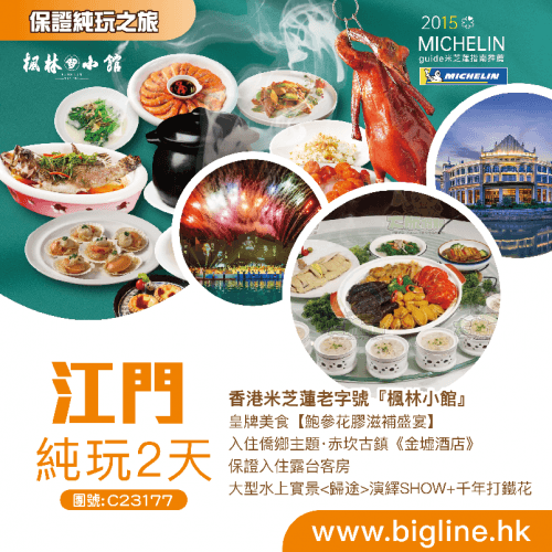 【星級廚房】香港米芝蓮老字號『楓林小館』+皇牌美食【鮑參花膠滋補盛宴】入住僑鄉主題·赤坎古鎮《金墟酒店》保證入住露台客房 大型水上實景演繹SHOW+千年打鐵花 純玩2天