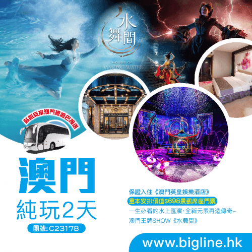 澳門之旅 ~ 保證入住《澳門英皇娛樂酒店》重本安排價值$698景觀席座門票 一生必看的水上匯演·全新元素再造傳奇-澳門王牌SHOW《水舞間》貼心安排澳門旅遊巴接送 純玩2天