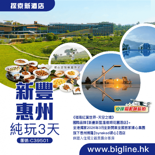【探索新酒店】《嶺南紅葉世界~天空之境》國際品牌【新豐新盟溫德姆花園酒店】+全港獨家2026年3月全新開業全國首家裸心集團旗下惠州博羅【bynaked裸心】酒店 保證入住獨立觀景露台房 純玩3天