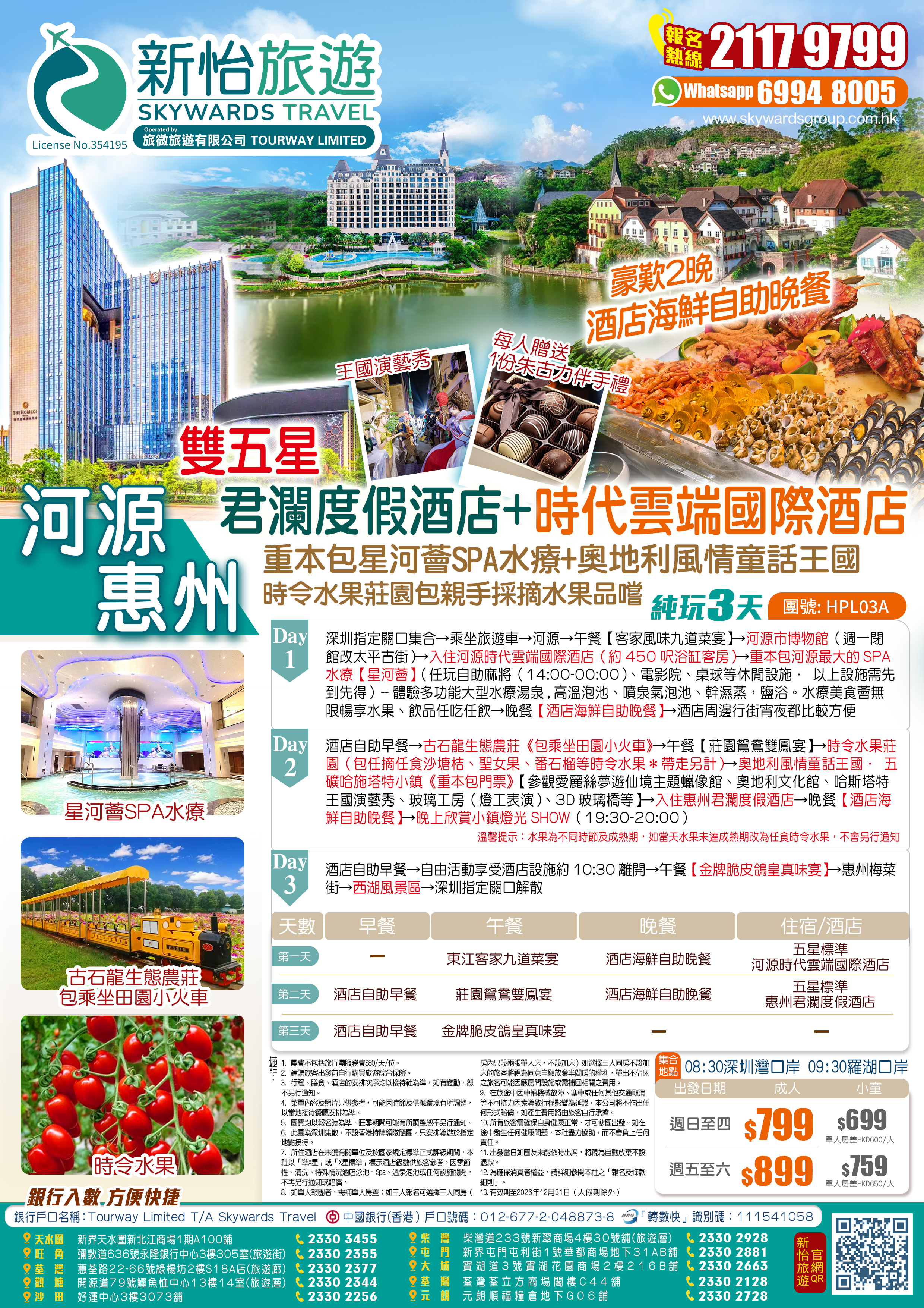 河源時代雲端國際酒店+惠州君瀾度假酒店【連歎2晚酒店海鮮自助晚餐】重本包星河薈SPA水療+奧地利風情童話王國《包親手採摘水果品嚐》純玩3天
