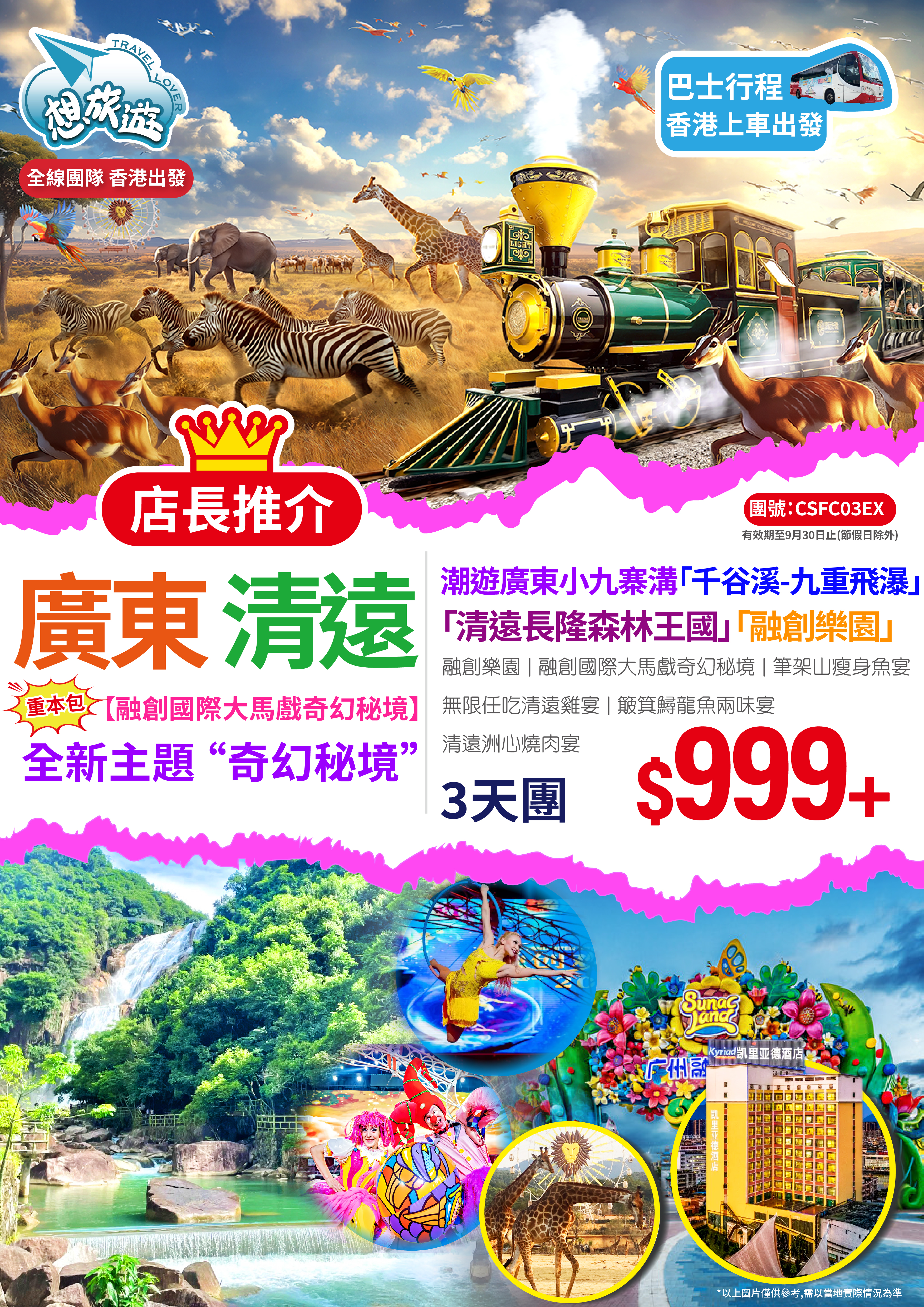 - 精選暢玩:融創國際大馬戲奇幻秘境、融創樂園、清遠長隆森林王國、千溪谷-九重飛瀑 特色品嘗:簸箕鱘龍魚兩味宴、清遠洲心燒肉宴、無限任吃清遠雞宴、筆架山瘦身魚宴 舒適入住:凱里亞德酒店或同級