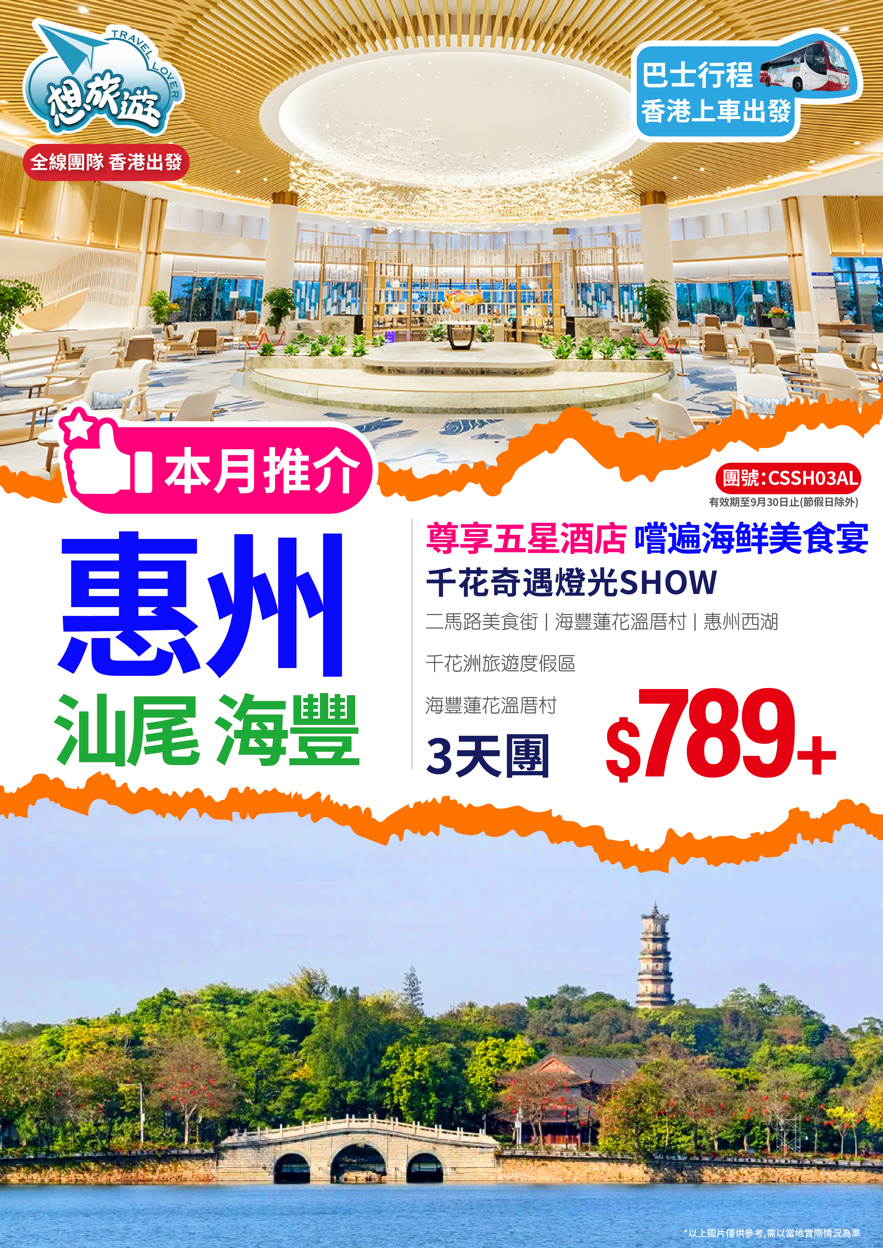 - 精選暢遊:二馬路美食街、海豐蓮花溫厝村、惠州西湖、千花洲旅遊度假區、千花奇遇燈光SHOW 特色品嚐:梅花林走地雞宴、汕尾鮮味魚蝦海鮮宴、客家美食風味宴、金牌脆皮乳鴿宴 保證入住:2025年全新開業漫心酒店/五星標準惠州千花洲度假酒店